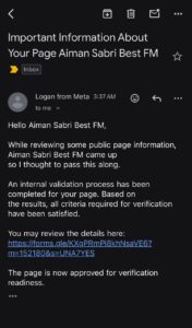 Gara-gara terpedaya “klik” dekat satu email – yang memang menyerupai Meta (FB & IG) menawarkan “verified button badge” di FB Page Aiman Sabri BestFM.