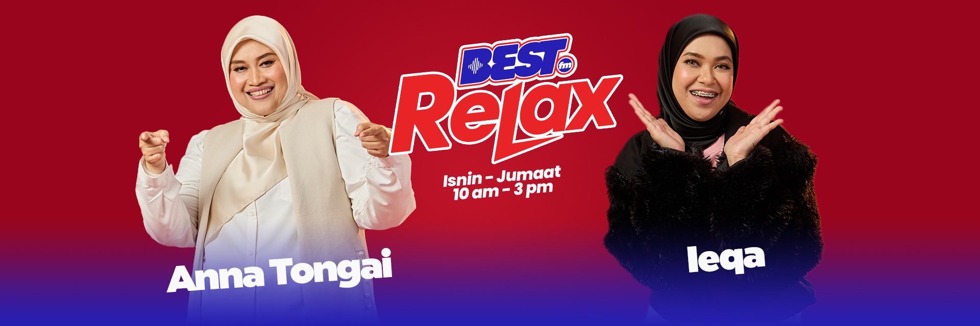 Meriahkan tengahari anda bersama penyampai Best Relax, Ieqa dan Anna Tongai setiap Isnin hingga Jumaat jam 10 pagi hingga 3 petang !